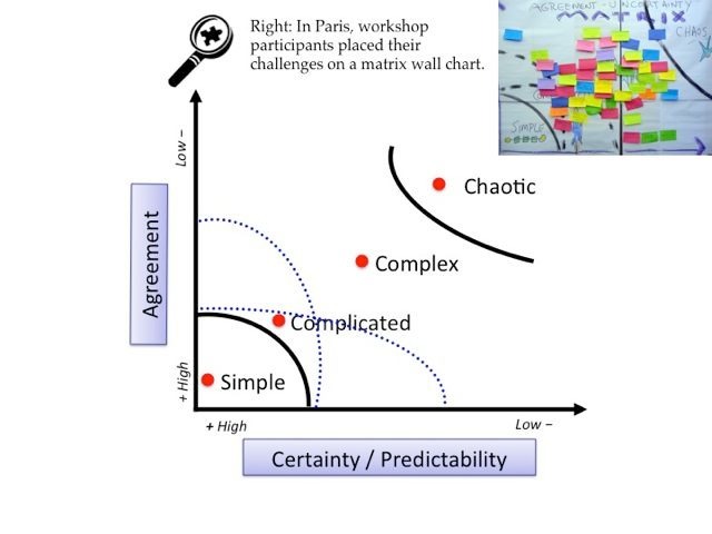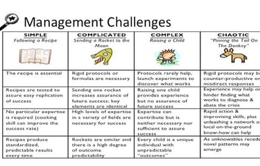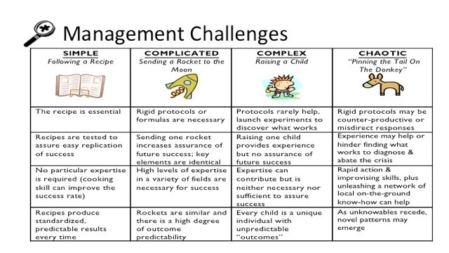 Ви можете допомогти окремим особам або групам уникнути типових помилок, коли вони намагаються вирішити проблему методами, які не відповідають характеру їхнього завдання. Комбінація з двох питань дозволяє легко класифікувати завдання за чотирма категоріями: прості, складні, комплексні та хаотичні. Проблема є простою, коли її можна успішно вирішити за допомогою методів, які легко повторити. Складна проблема, коли для розробки ефективного рішення, яке дасть бажані результати, потрібні експерти. Проблема є комплексною, коли існує кілька можливих способів її вирішення, але результати не можна передбачити в деталях. Хаотичною проблема є тоді, коли контекст є надто нестабільним, щоб визначити шлях до її вирішення. Ці відмінності можна описати за допомогою приблизної аналогії: проста проблема - це як слідувати рецепту, складна - як відправити ракету на Місяць, комплексна - як виховати дитину, а хаотична - як гра "Прикріпи хвіст ослику". Вивільнююча структура "Матриця відповідності" в розділі 5 може бути використана як перший крок для з'ясування природи виклику та уникнення невідповідності між проблемами та рішеннями, які часто є причиною хронічних, повторюваних проблем.