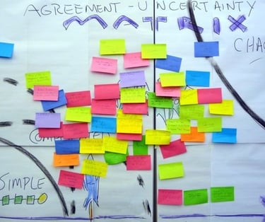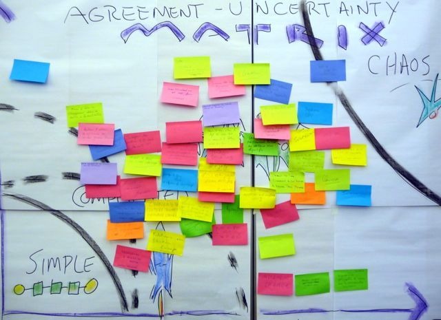Нижче: нотатки-стікери учасників ілюструють розміщення елементів на Матриці узгодження та визначеності - кожен стікер представляє діяльність або програму в організації, видиму для всіх.