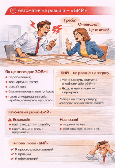 Людина в цій реакції зазвичай щиро переконана, що вона просто раціональна, пряма або ефективна - це типова ілюзія реакції «БИЙ».