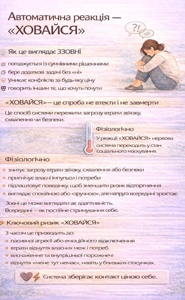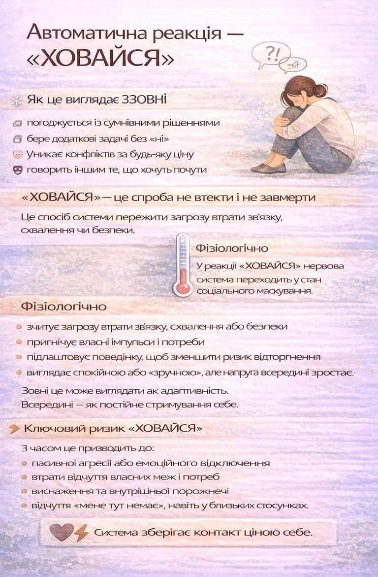 Саме тому «ХОВАЙСЯ» часто маскується під ввічливість, гнучкість, зрілість або турботу. І саме тому її складно помітити як проблему, бо ззовні все виглядає «нормально».