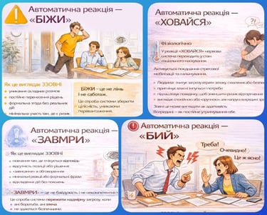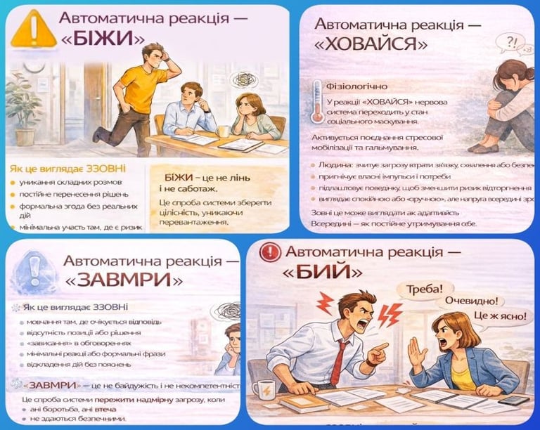 Наш мозок не створений для постійної невизначеності, тиску і соціальних ризиків; його базове завдання — зберегти цілісність і безпеку. І коли рівень загрози перевищує ресурс, включається не «усвідомлений вибір», а найбільш притаманна автоматична стратегія: БИЙ-БІЖИ-ЗАВМРИ-ХОВАЙСЯ.