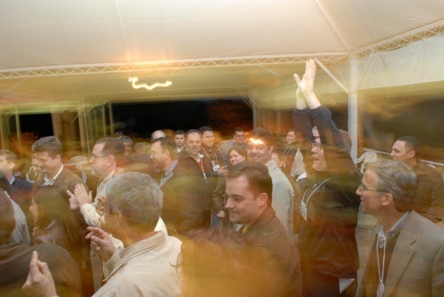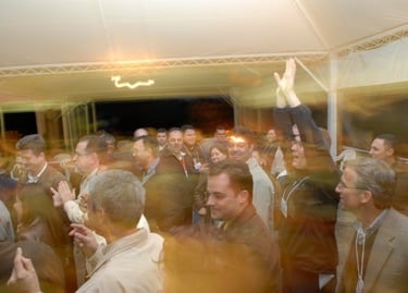 Групи з 4 до 7 осіб, сидячи навколо невеликих столиків.