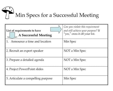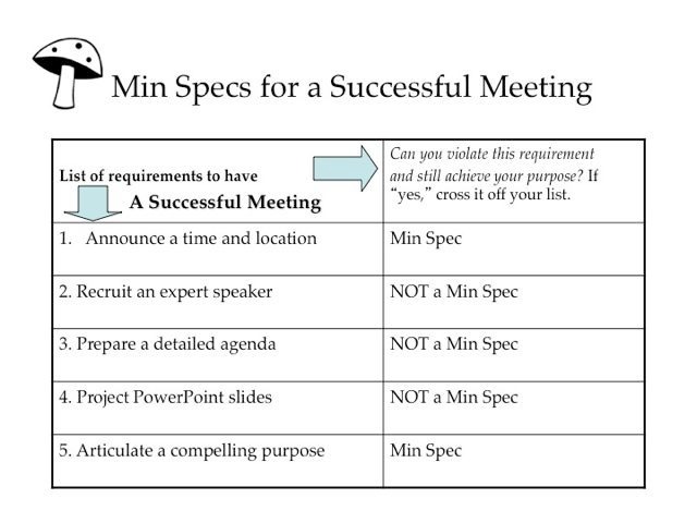 У контексті складної діяльності, нової ініціативи або стратегічного глухого кута запросіть учасників спочатку скласти повний перелік усіх дій та застережень, на які вони повинні звернути увагу, щоб досягти успішного результату. Це перелік максимальних вимог (Max Specs).