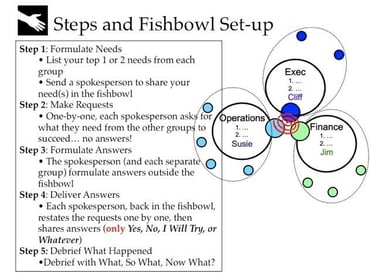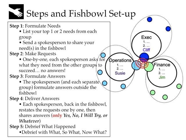 За допомогою методу "1-2-4-всі" (або "1-2-всі") функціональні групи складають список своїх найважливіших потреб від кожної з інших груп у кімнаті. Потреби формулюються як запити, які можна виконати з обережністю та ретельністю, у такій формі: "Мені потрібно від вас _____". Групи скорочують свої списки до двох найважливіших потреб, записують їх у списку бажань, обирають представника, який буде виступати від імені групи. 5–15 хв