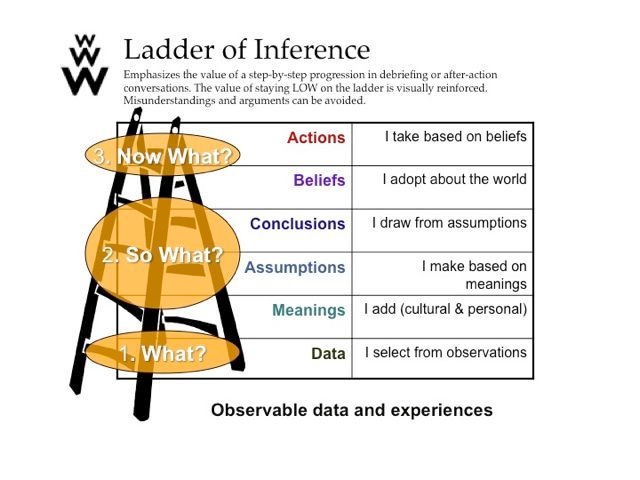 Не перестрибуйте етап «То що?» занадто швидко. Людям може бути складно пов'язати спостереження безпосередньо з закономірностями. Це найскладніше з трьох питань «Що?». Використовуйте «Драбину висновків» як нагадування про логічні кроки «вгору по сходах» від спостережень до дій.