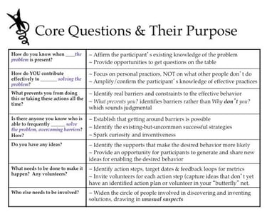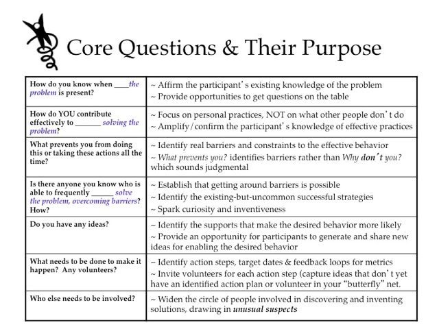 Запросіть людей розкрити неявні або приховані рішення спільної проблеми, які ховаються серед людей їхньої робочої групи, підрозділу або спільноти. Попросіть усіх, хто зацікавлений у вирішенні проблеми, приєднатися до невеликої групи та взяти участь у Діалогу пошуку і дії. У групі задайте сім послідовних запитань: